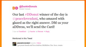 For example, the past few holiday seasons DD have hosted a HoliDDay Sweater Contest on Twitter, where they asked followers of @DunkinDonuts to submit photos of themselves wearing their favorite and most festive holiday garb for the chance to win a $50 Dunkin’ Donuts Card during the holiday season. For Mother’s Day, in honor of the Mom’s Heart Donut, Dunkin’ Donuts asked followers of @DunkinDonuts to tweet why they “heart” their mom for the chance to win prizes for themselves and for their mothers including two Keurig Brewers, two Dunkin’ Donuts K-Cup Packs and one “This Mom Runs On Dunkin’” Tumbler. On Black Friday, Dunkin’ Donuts saw its largest daily increase of followers for the year during the “Dunkin’ Donuts Puts the ‘K’ in Black Friday” Twitter contest. The morning of Black Friday, followers of @DunkinDonuts could submit how Dunkin’ Donuts keeps them running on Black Friday for the chance to win a Keurig Brewer and Dunkin’ Donuts K-Cup packs.