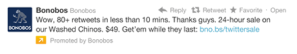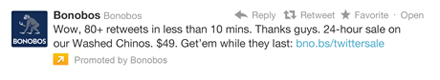 Let’s go deeper with few case studies like Bonobos (a premium web-driven men’s apparel brand and e-tailer) with his last Twitter exclusive sales, a “Twixlusive,” a 24-hour sale.