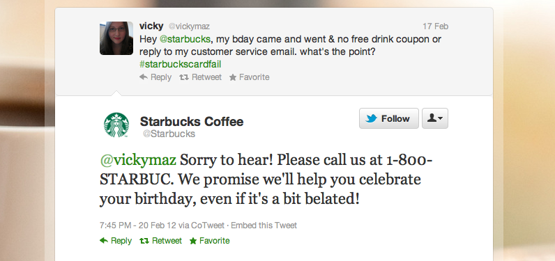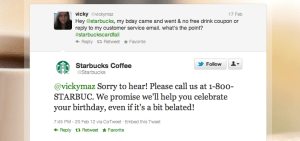 Twitter also helps maintaining relationship between Starbucks and customers because they could communicate one on one instantly. This can be incredible beneficial for both Starbucks getting feedback from customers and customers knowing promotions, awards, sales about Starbucks.